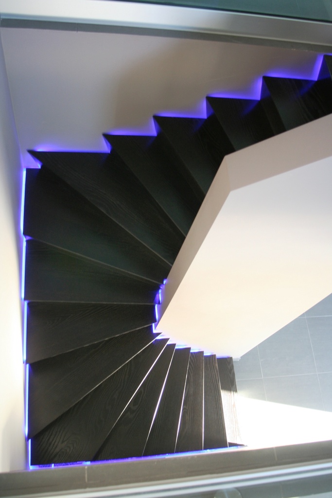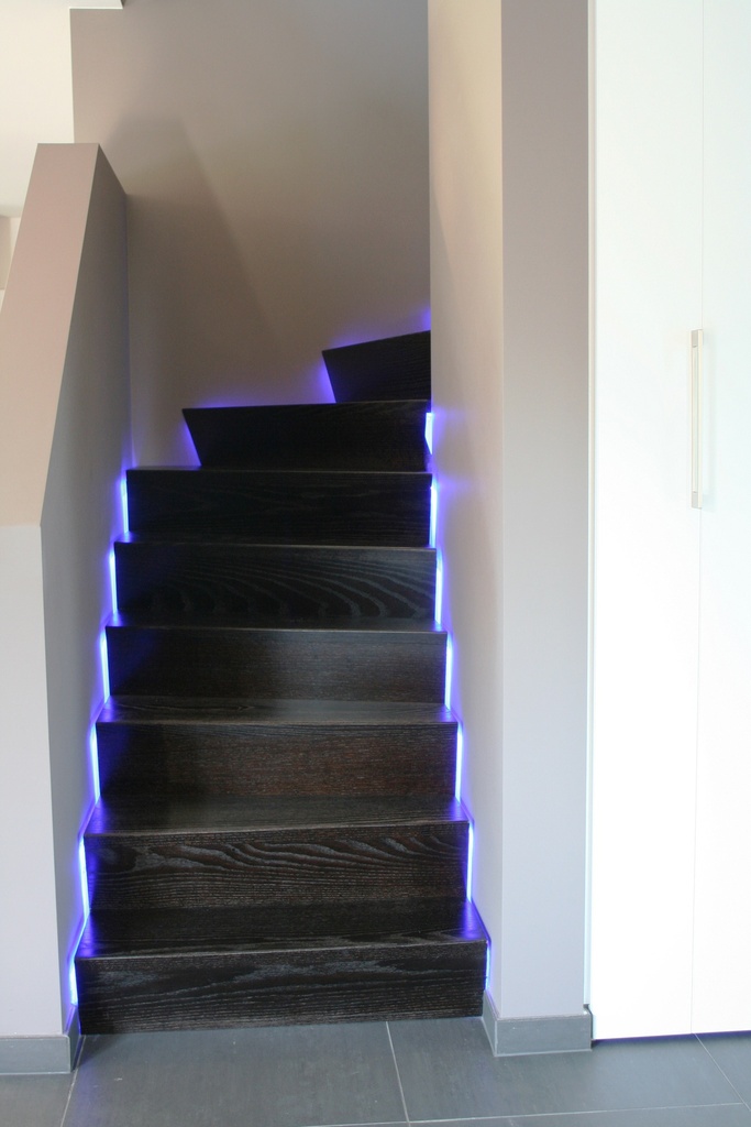 Cet escalier à double quart tournant était pourvu d'un mur intérieur qui se prolonge jusqu'au premier étage. Une rainure a été prévue entre le mur et l'escalier pour placer une bande LED.