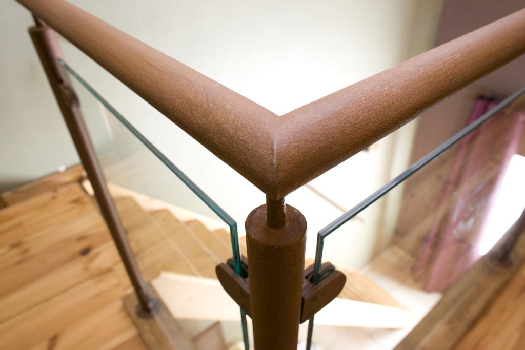 Trap in den, voorzien van trapbomen in witte grondlaag en verniste treden. De trap is voorzien van een ronde muurleuning in geroest staal, chemisch verankerd. De balustrade op het verdiep is een combinatie van gelaagd glas met metaal.